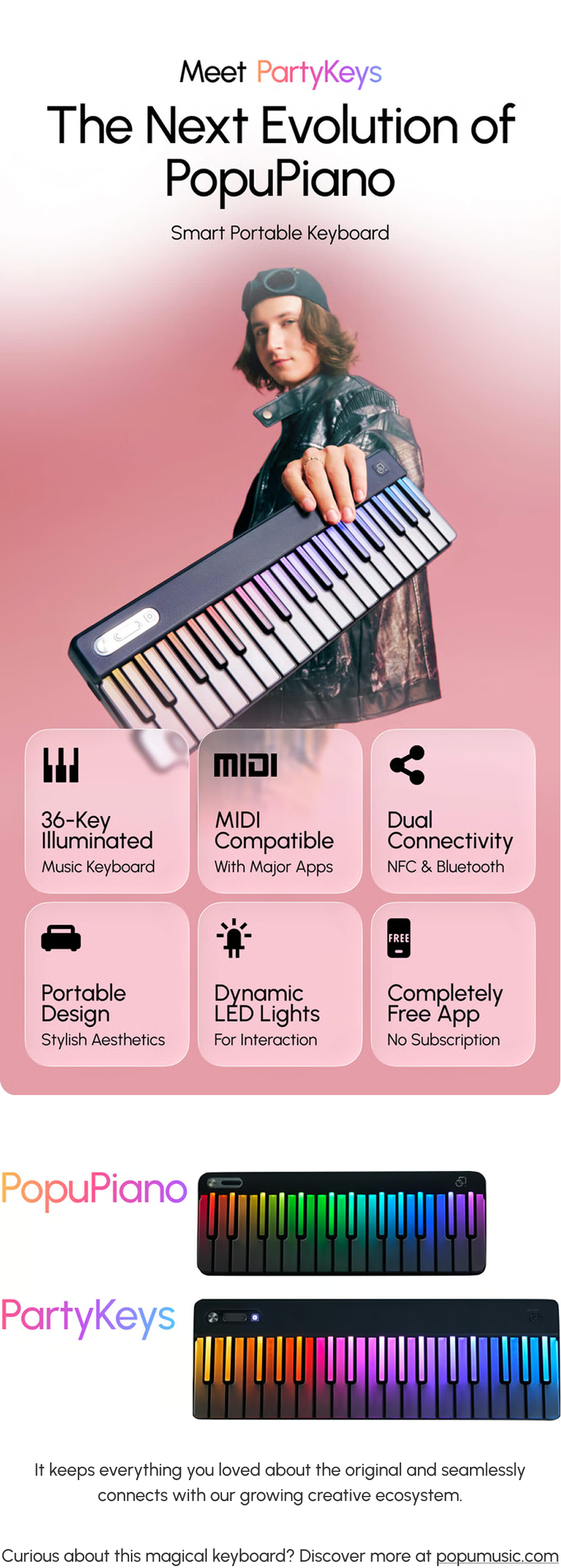 Each PartyKeys comes with 36 keys and can connect with up to two more keyboards, giving you a full 108-key setup, yes that's even more than a traditional 88-key piano.