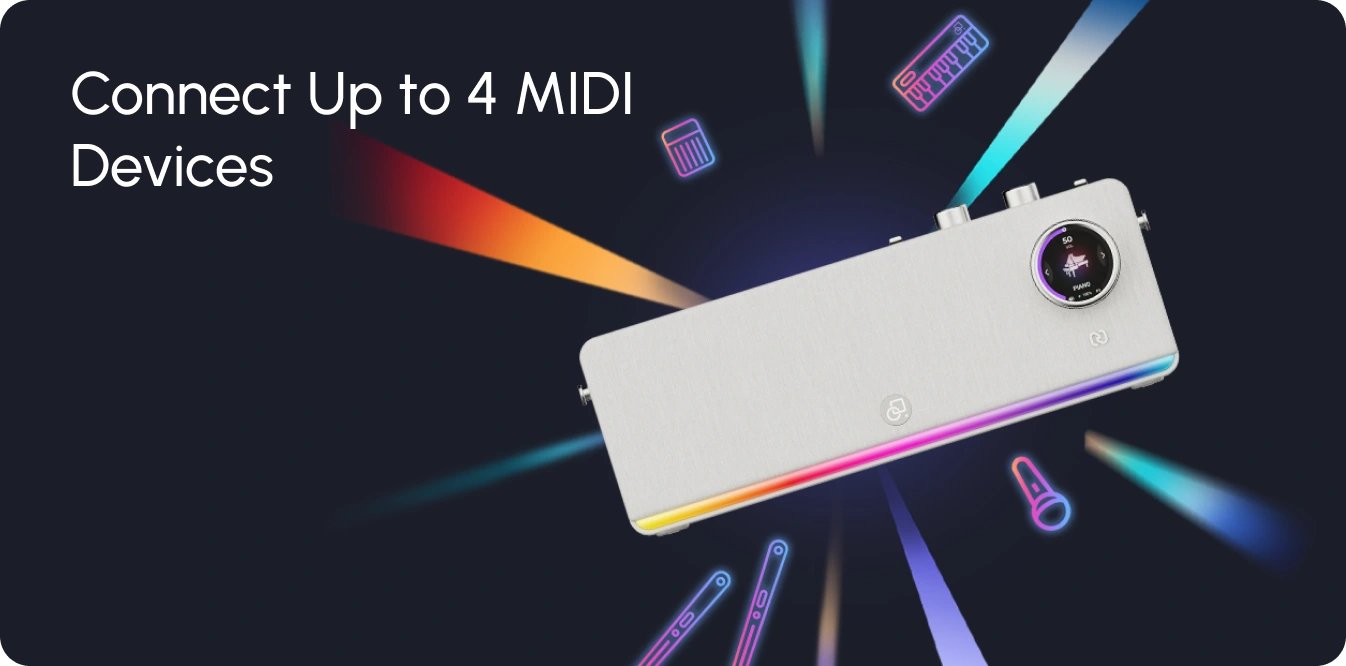 Built-in sound engine. Real instrument tones from any MIDI keyboard — no laptop required.