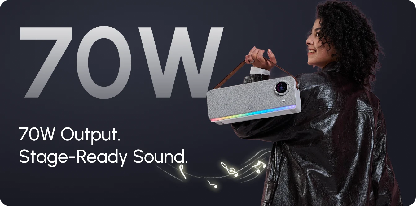 Dual 10W tweeters + dual 25W mid-bass drivers deliver 70W of clean, punchy output — with room-filling projection.